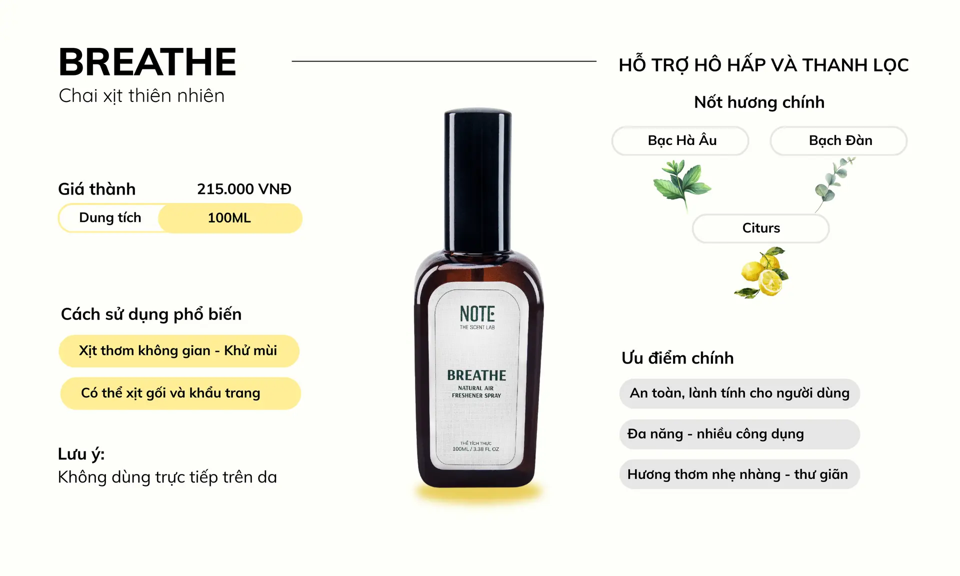 Chỉ vài lần xịt “BREATHE” có thể giúp căn phòng bớt nặng nề, mang lại cảm giác mát lành, thoáng sạch – lý tưởng cho những ngày oi bức, sau khi ở lâu trong phòng kín, hoặc những lúc bạn muốn “làm mới” không khí xung quanh.