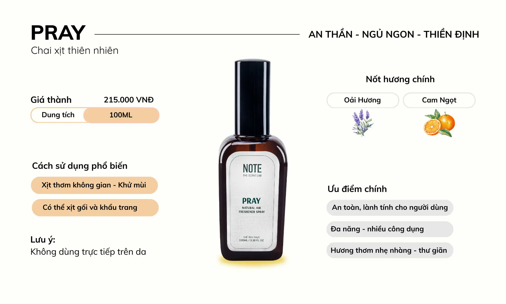Thành phần: Hỗn hợp tinh dầu “PRAY”, Alcohol Denat, Nước cất