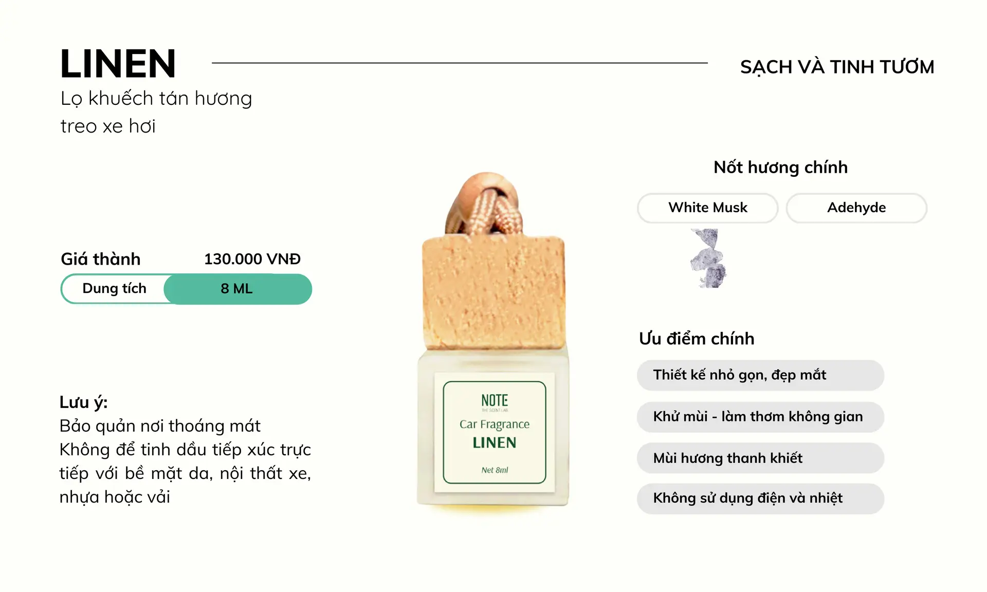 Với thiết kế lọ treo nhỏ gọn, "LINEN" phù hợp cho những ai yêu cảm giác không gian luôn gọn gàng, thơm tho mà vẫn tự nhiên. Hương thơm nhẹ, không áp đảo, giúp xe và các không gian nhỏ như tủ quần áo, góc làm việc hay phòng nhỏ luôn giữ được cảm giác tươm tất, chỉn chu mà không cần quá nhiều chi tiết.