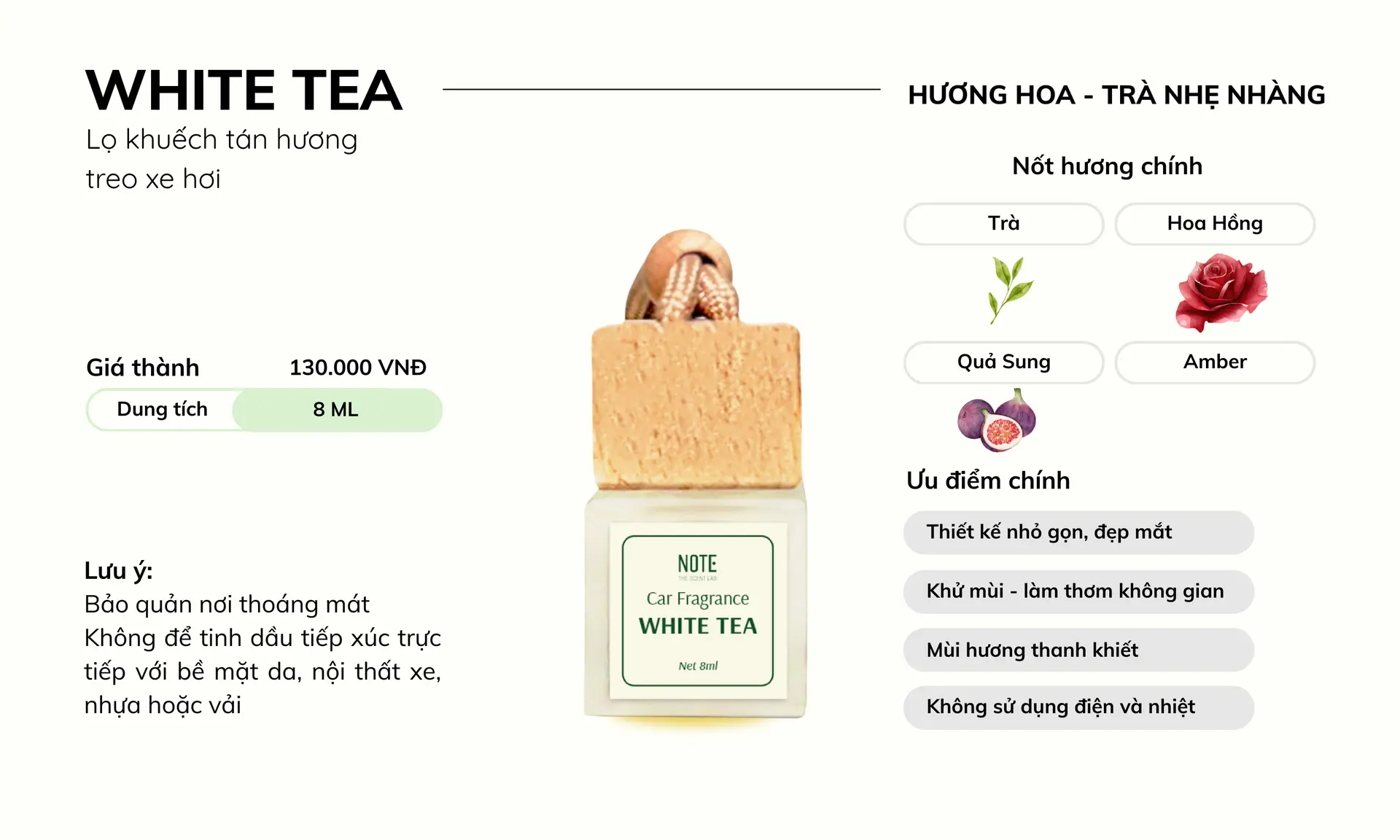 Nhỏ gọn và tinh tế, "WHITE TEA" là lựa chọn phù hợp cho những ai yêu mùi hương nhẹ nhàng, trong trẻo và dễ chịu, đủ để làm không gian xe, tủ quần áo hay góc nhỏ của bạn trở nên an yên hơn, nhưng vẫn giữ được sự tiết chế và tinh gọn.