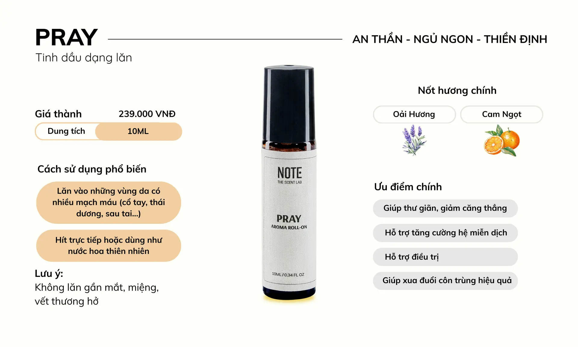 Dạng lăn tiện dụng giúp "PRAY" trở thành một nghi thức nhỏ trong ngày, một lần lăn lên cổ tay, một hơi thở chậm, đủ để nhắc mình tạm dừng, lắng lại và dịu đi. Phù hợp cho thiền, yoga, trước giờ ngủ hoặc bất kỳ lúc nào bạn cần một khoảng lặng riêng tư.