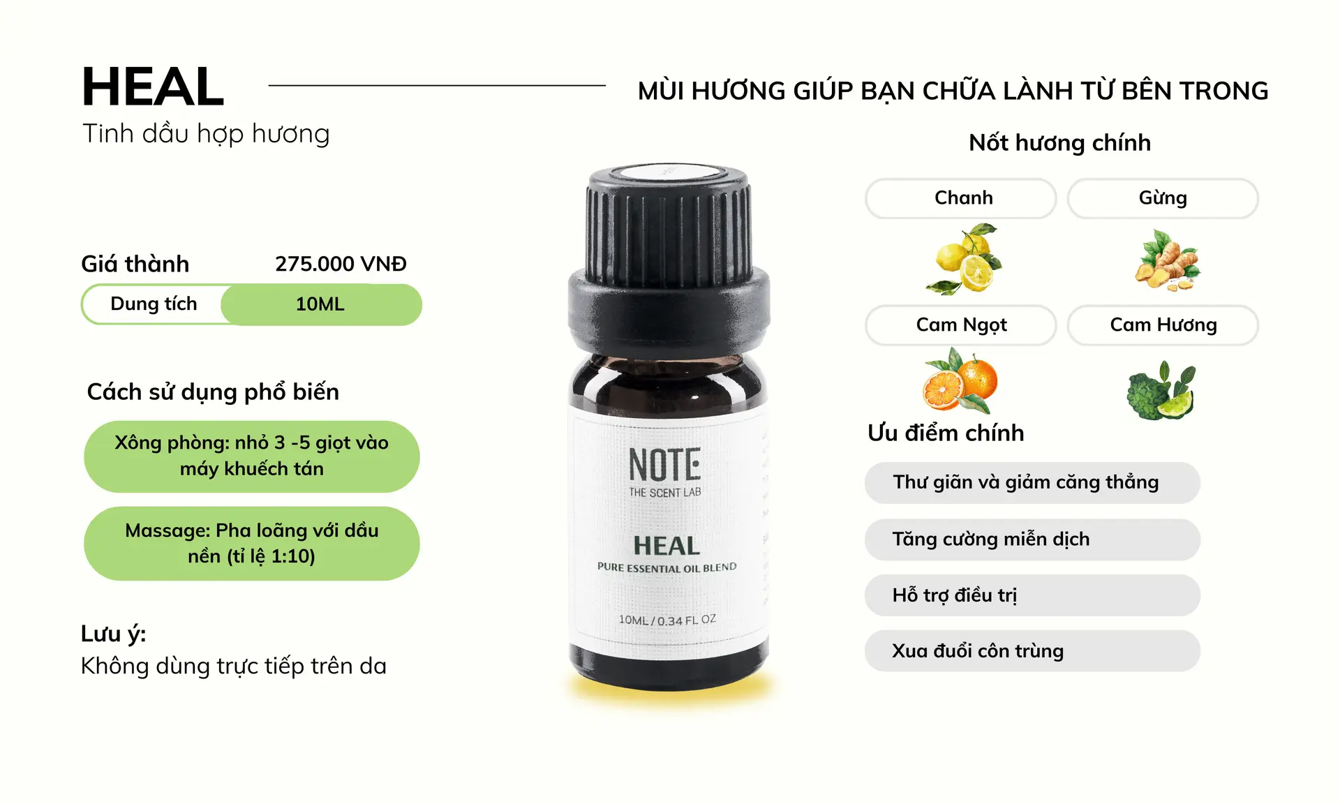 “HEAL” là lựa chọn lý tưởng cho những lúc cơ thể xuống sức hoặc tâm trí nặng nề. Chỉ vài giọt khi xông phòng hoặc một hơi thở sâu cũng có thể mang lại cảm giác phục hồi, nhẹ nhàng và ấm áp như được chữa lành từ bên trong.